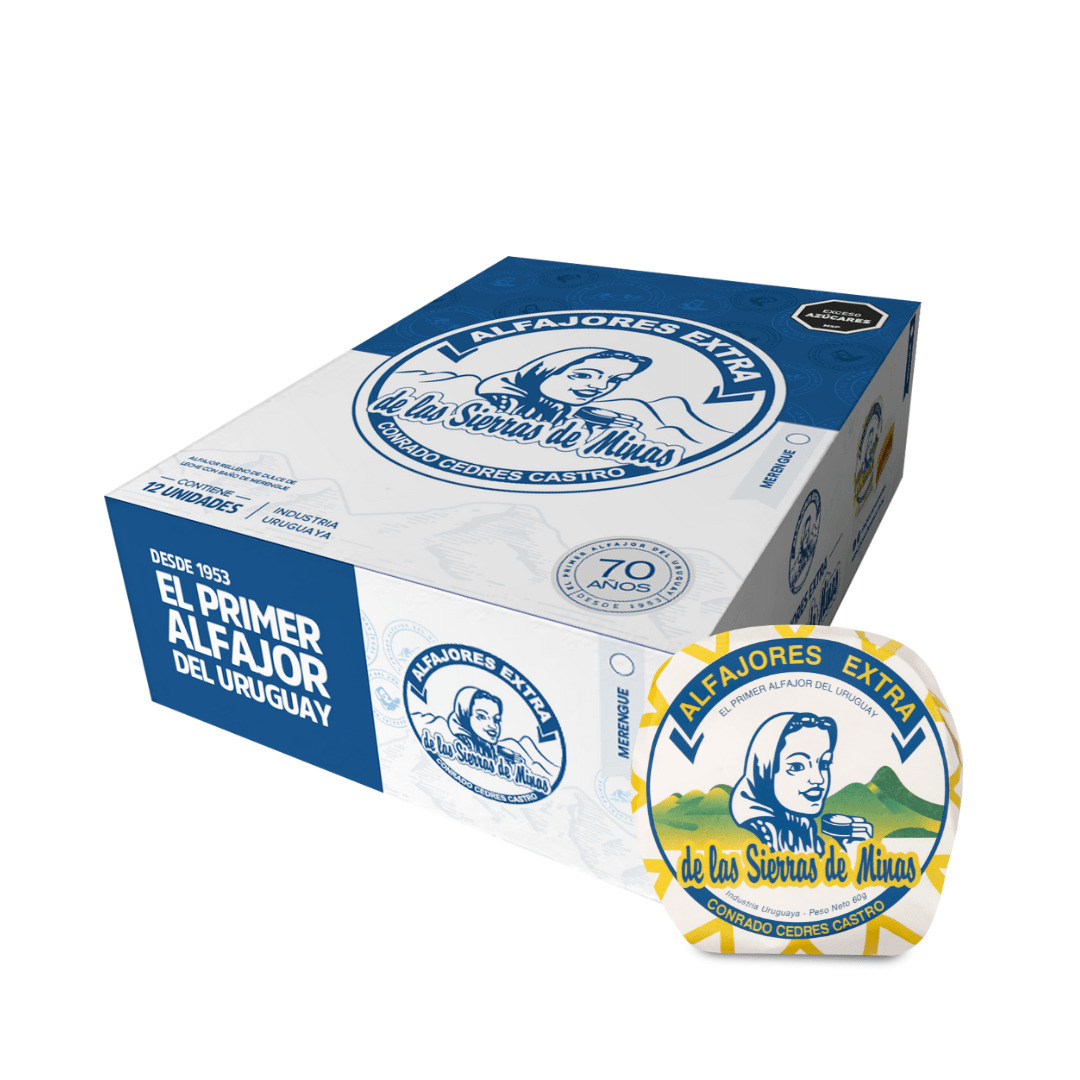 Alfajor relleno de dulce de leche con baño de merengue 65g. Preço do site está em pesos uruguaios (UYU), não em USD. Valor correto do produto: 843 UYU.