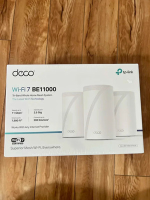 The TP-LINK DECO BE11000 Wi-Fi 7 TRI-BAND Whole Home Mesh System 3-Pack is a brand new, white wireless router designed for PC use. It features a maximum LAN data rate of 1000 Mbps and a maximum wireless data rate of 1167 Mbps, providing fast and reliable connectivity throughout your home. With its tri-band technology and four LAN ports, this system ensures seamless and secure Wi-Fi coverage for all your devices. Additionally, it comes with a manufacturer warranty of 2 years, making it a durable and trustworthy choice for your networking needs.